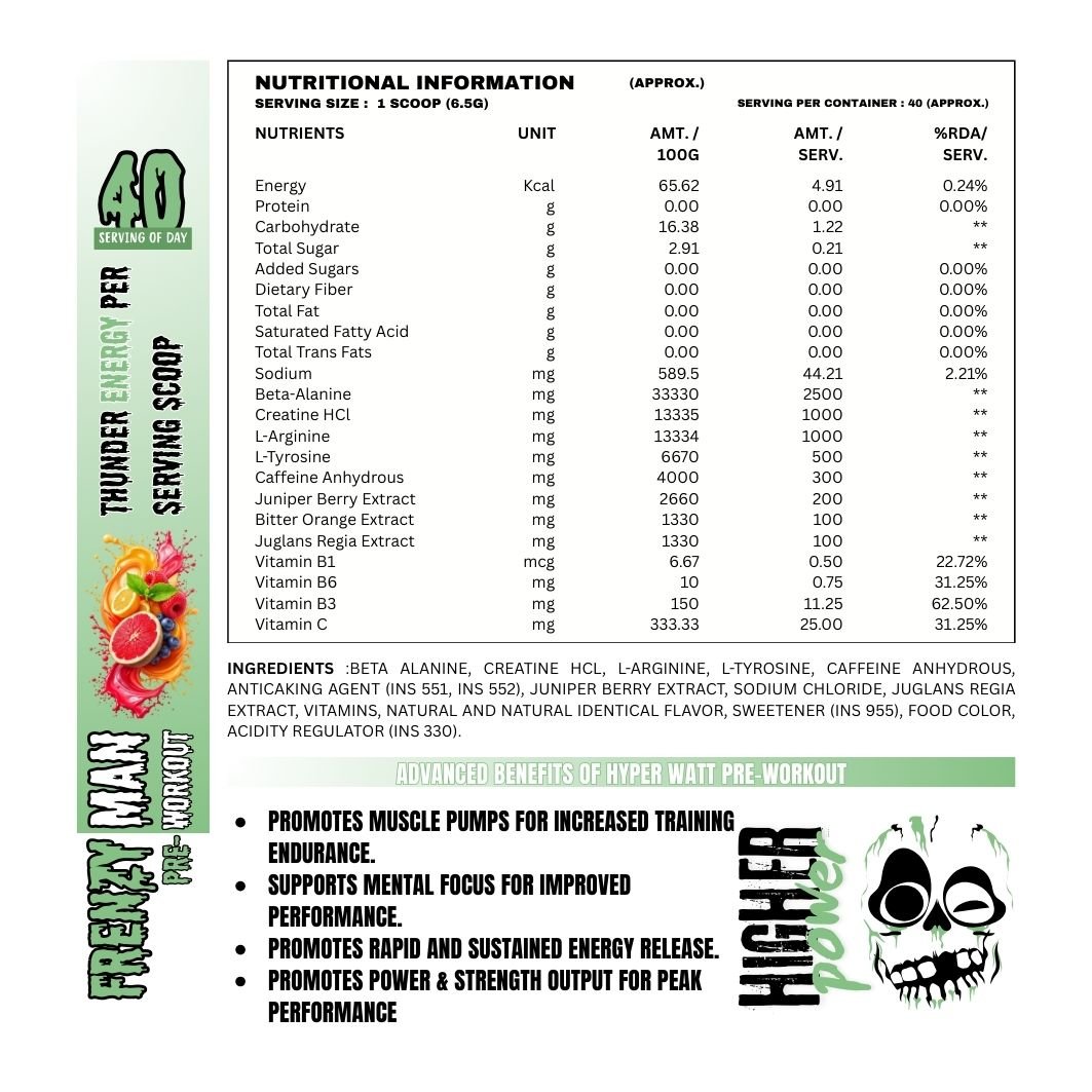 With 2500 mg of Beta-Alanine, this formula helps reduce muscle fatigue and supports longer, more intense workouts. Creatine HCL (1000 mg) plays a key role in improving power output and strength performance, making it ideal for heavy training days.